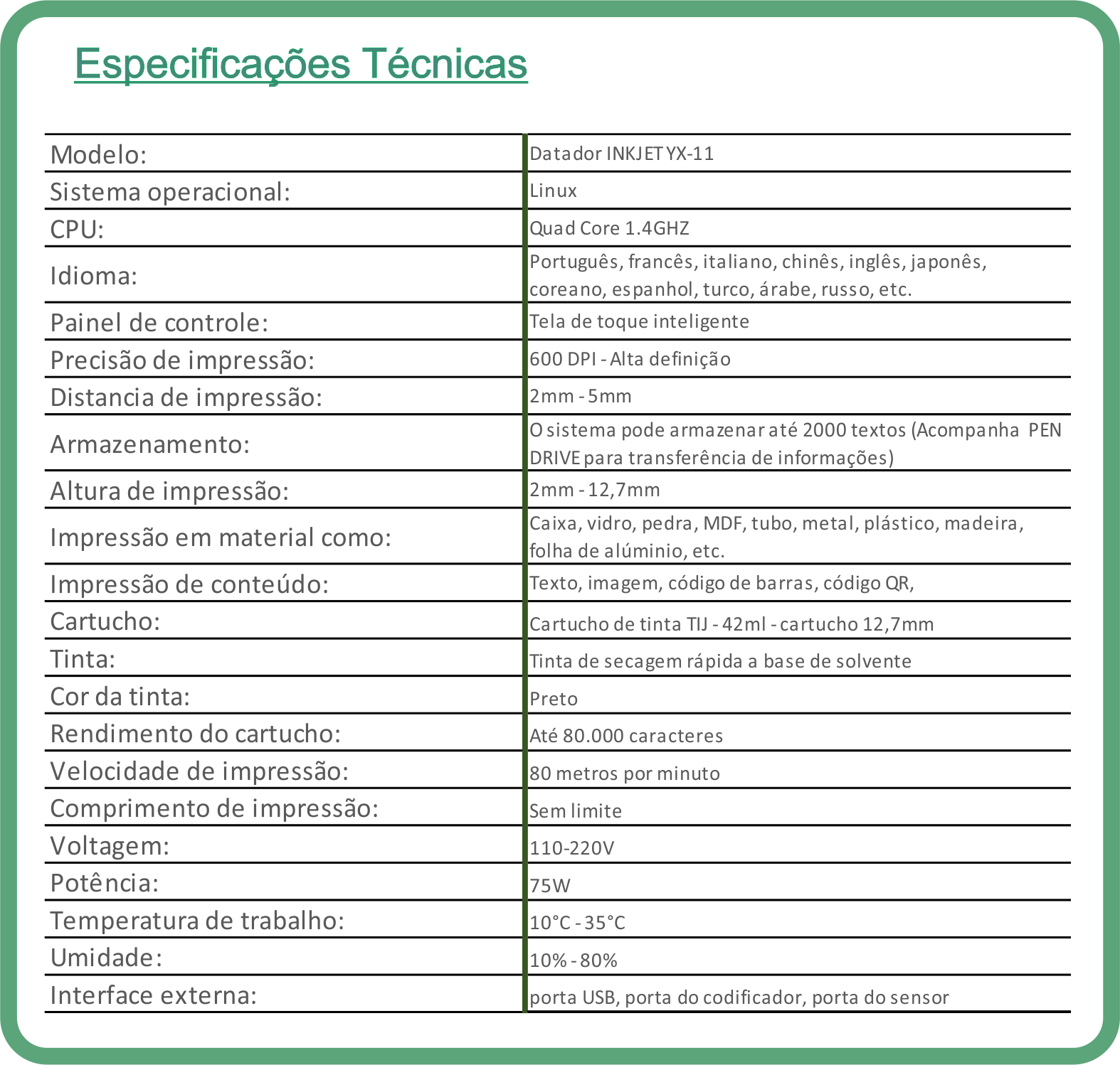 INKJET YX-11 é uma impressora a jato de tinta de alta resolução com tecnologia TIJ 2.5